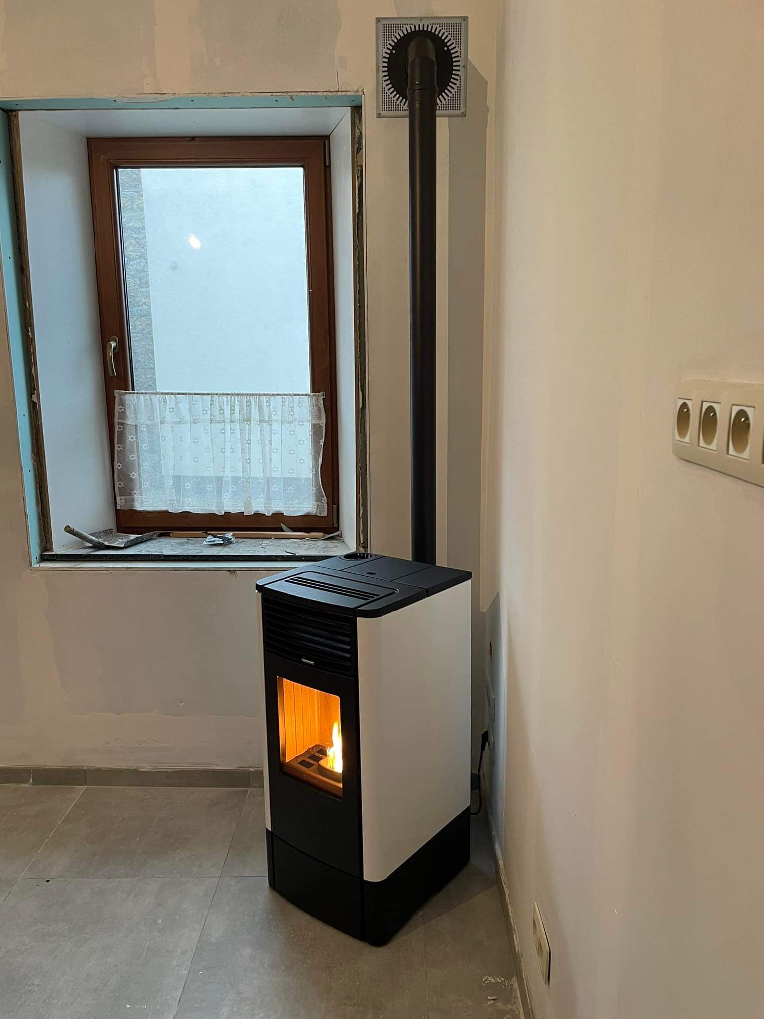 Ravelli S 90 couleur blanc avec sa plaque d’écart au feu pour le passage de mur en gyproc isolé.